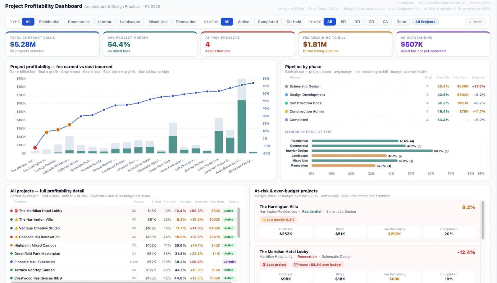 Track every project's financial health in one view. See contract value, billed amount, margin, budget overrun, and fee remaining per project. Instantly spot which projects are losing money, which are at-risk, and where your pipeline stands by phase.