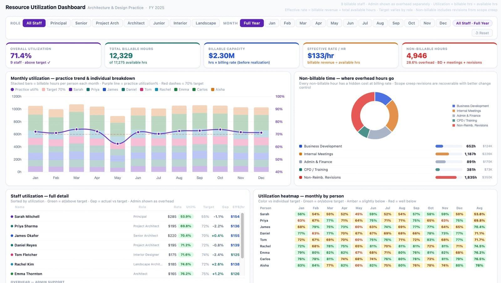 See how productively your team's time is being used. Track billable vs non-billable hours per person, utilization against individual targets, recovered revenue per available hour, and where overhead time is leaking — by role or by month.