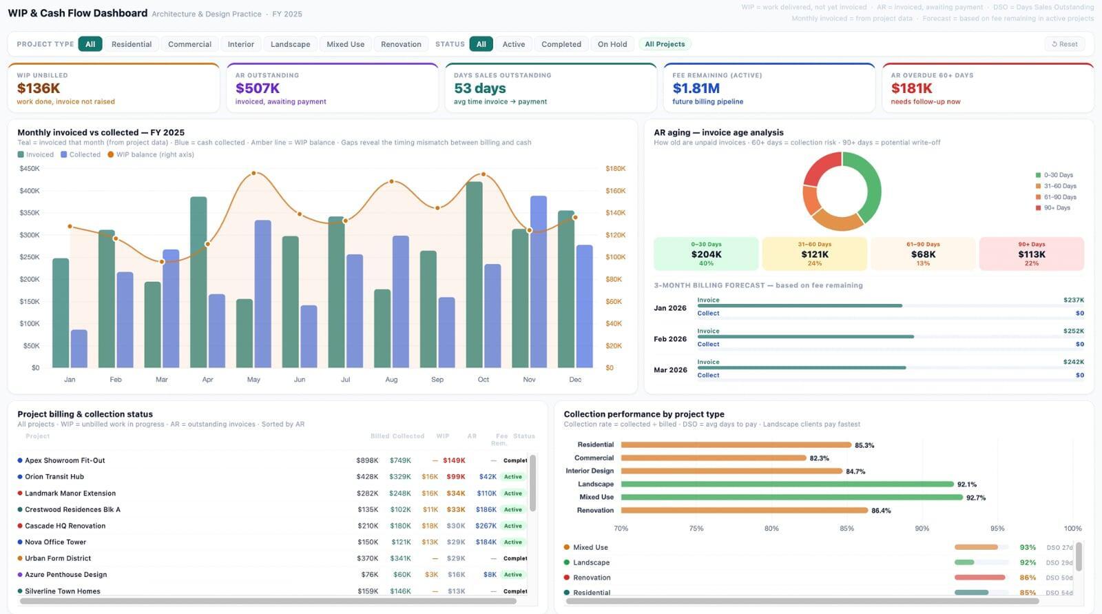 Know exactly where your cash is stuck. Monitor unbilled work (WIP), outstanding invoices (AR), how fast clients pay (DSO), and what billing is expected next 30 days. Identify overdue invoices before they become write-offs.